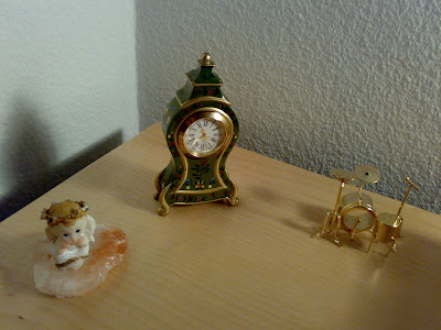 Lastly, some small decors on my table. From right, there is my first drum set from dearest CHIALING! Then thats my antique clock that I bought from Prague, Czech Republic. Lastly, my dearest pouting angel sitting on a piece of salt which I bought from Krakow salt mine in Poland.